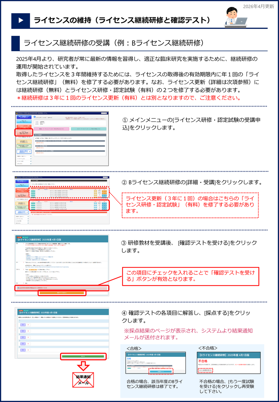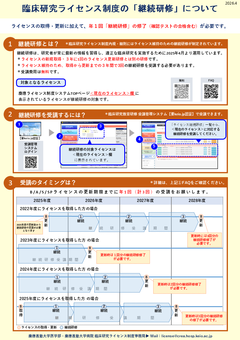 - 臨床研究ライセンス制度 継続研修開始のお知らせ(2026/4/1)