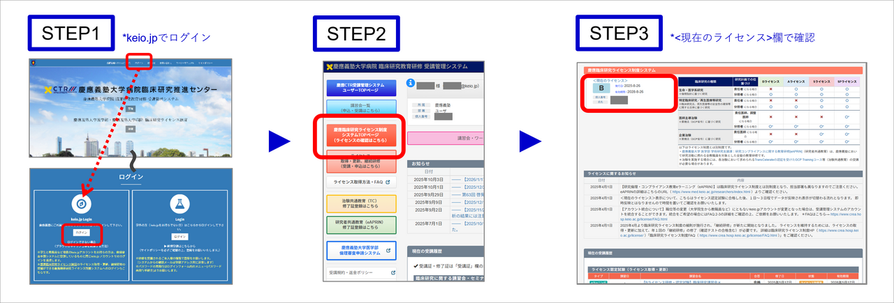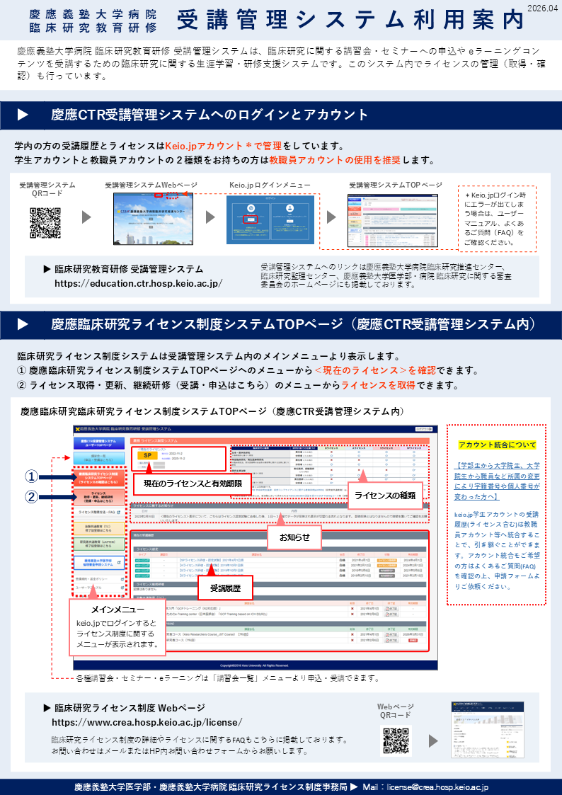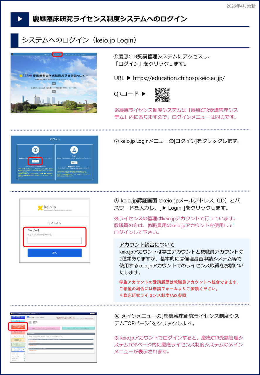 慶應義塾大学医学部・病院 臨床研究ライセンス制度のライセンスはkeio.jpアカウントで管理しており、ライセンスの取得・更新、継続研修の受講や取得ラ イセンスの確認などは慶應CTR受講管理システム内「慶應臨床研究ライセンス制度システム」で行います。慶應臨床研究ライセンス制度システムは、慶應CTR受講管理システムにkeio.jpアカウントでログインすることで利用できます。