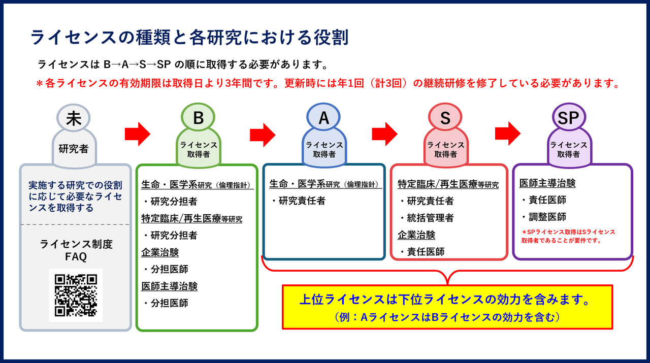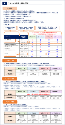 *「ライセンスの種類と各研究における役割」、「ライセンスの取得~維持~更新までの流れ」については下図をご参照ください。