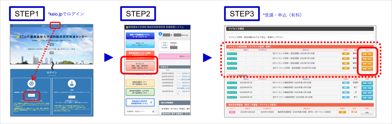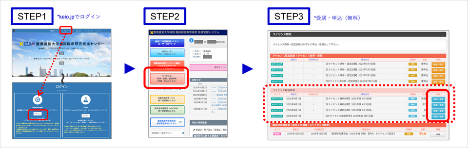 1.慶應臨床研究ライセンス制度システム*にkeio.jpでログインする[STEP1]。