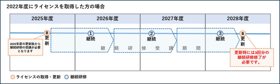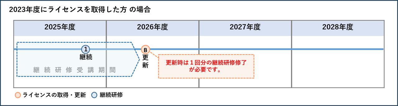 *2026年度の更新時には、1回分の継続研修の修了(2025年度分もしくは、2026年度分)が必要です(下図参照)。