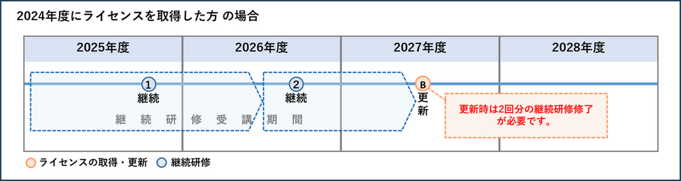 *2027年度の更新時には、2回分の継続研修の修了(2025年度・2026年度分もしくは、2026年度・2027年度分)が必要です(下図参照)。
