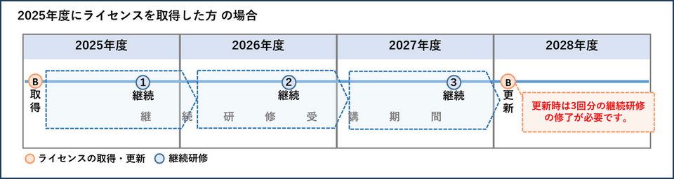 *2028年度の更新時には、3回分の継続研修の修了(2025年度・2026年度・2027年度分もしくは、2026年度・2027年度・2028年度分)が必要です(下図参照)。