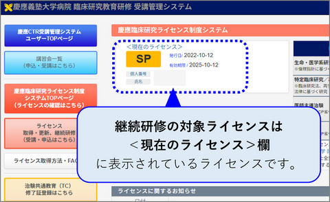 A.4-8 慶應臨床研究ライセンス制度システムTOPページの【<現在のライセンス>欄】に表示されている現在有効なライセンスが継続研修の対象となります(下図参照)。